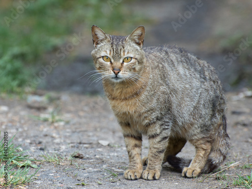 Portrait of a stray cat. Frightened look of an animal.