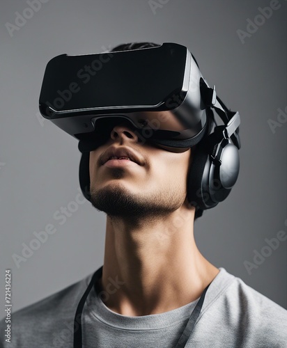 portrait of a student wearing virtual reality glasses, isolated grey background