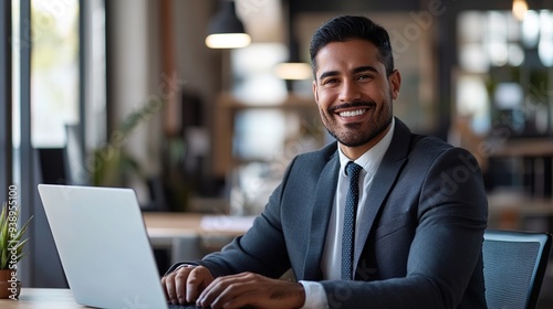Portrait of a stylish Hispanic businessman working on a laptop in a modern office, smiling confidently