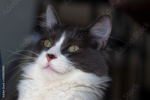 Portrait of a surprised Domestic medium hair cat lying and relaxing on cat tower. Blurred background. Relaxed domestic cat at home, indoor
