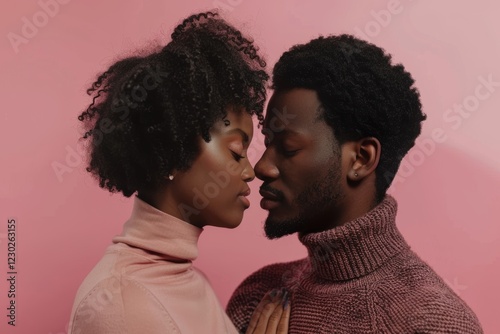 Portrait of a tender afro-american couple in their 30s wearing a classic turtleneck sweater isolated on pastel pink background
