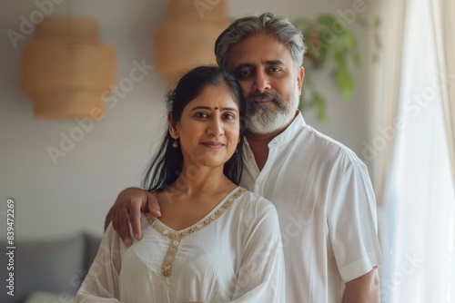 Portrait of a tender indian couple in their 40s sporting a long-sleeved thermal undershirt over modern minimalist interior