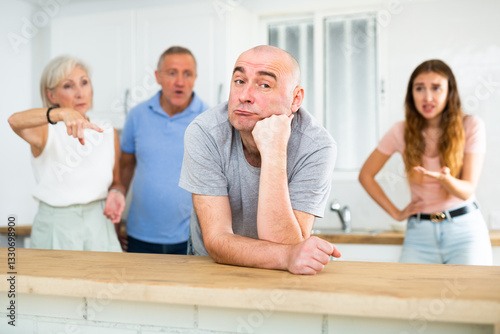 Portrait of a thoughtful man who had a conflict with his wife and parents while cooking dinner in the kitchen