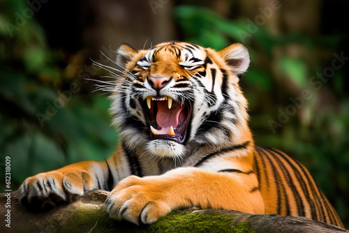Portrait of a tiger. Tiger growls lying down in natural habitat