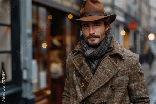Portrait of a trendy man with a beard wearing a brown fedora and winter coat