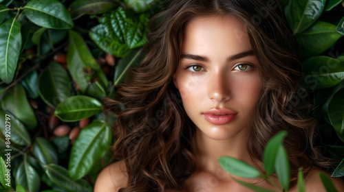 portrait of a woman. Beautiful young woman posing for a hair product campaign, shiny brown hair, black wearing, Argan seeds nuts and leaves background, plants atmosphere