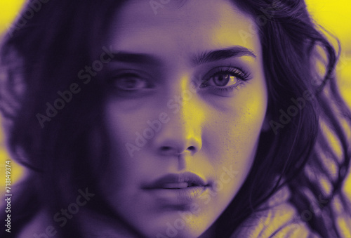 Portrait of a woman. Graphic design poster with effects in yellow and purple color.