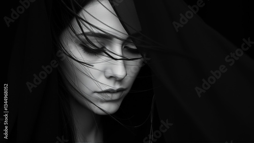 Portrait of a Woman in a Black Mourning Veil on Her Head