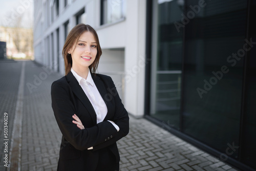 Portrait of a woman in business clothes on the street with her arms crossed on her chest