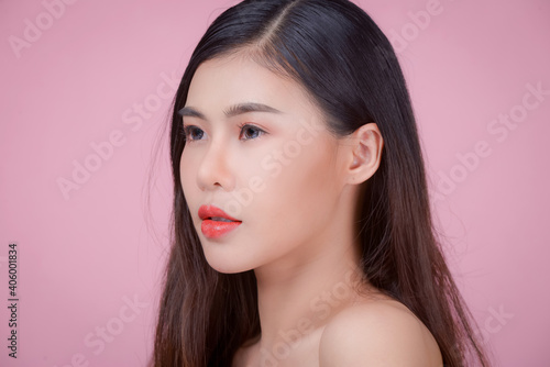 Portrait of a woman using water to wash her face, Beauty Spa Woman with perfect skin Portrait. Asian beautiful woman skin makeup young model,on pink studio