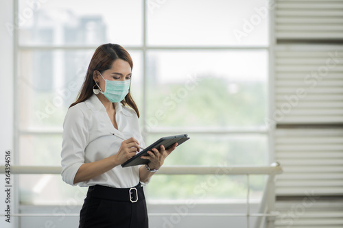 Portrait of a young adult Asian business woman in white shirt and black long pants wears surgical facemask looking on tablet in company building during VOCID-19 pandemic. Business stock photo.
