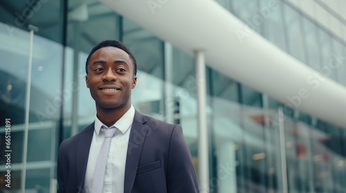 Portrait of a young African American businessman in front of a modern corporate glass building