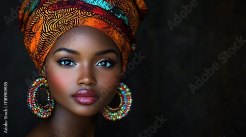 Portrait of a young African woman showcasing cultural pride with vibrant headwrap and jewelry, ideal for Black History Month and heritage celebrations.