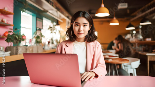 .Portrait of a young Asian girl in pink clothes uses a laptop while sitting at a table in a cafe with copy space. Asian girl freelancer or student.looks into the camera and smiles.