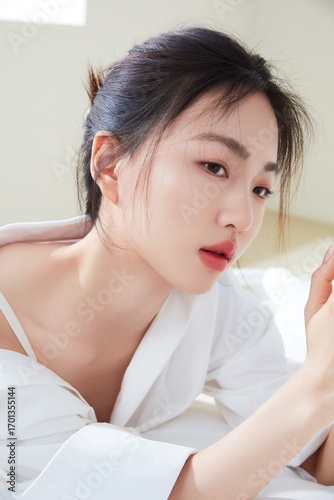 Portrait of a young Asian woman in a white shirt, looking thoughtfully indoors.