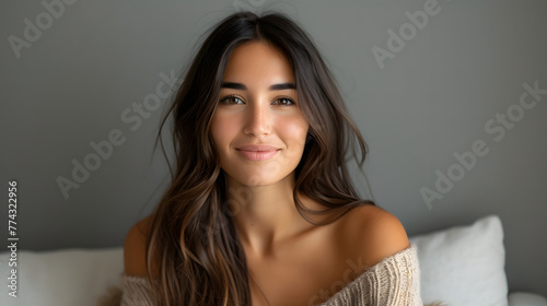 Portrait of a young, attractive female with long hair smiling gently, looking directly at the camera. Young woman smiling gently at camera.