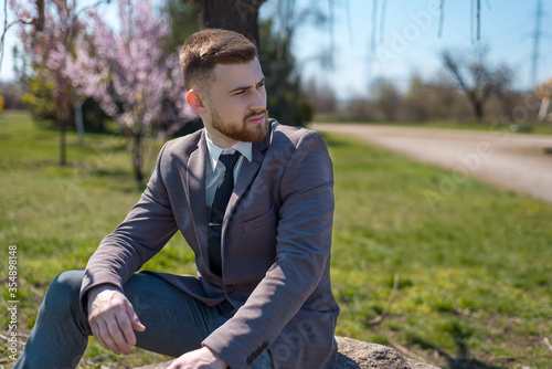 Portrait of a young bearded guy with closed eyes, from whose head a tree grows. on open air. In creative artistic toning. Business concept The birth of thoughts, ideas in the form of a growing tree.