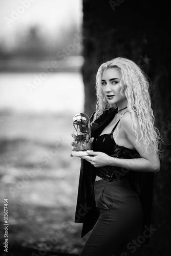 Portrait of a young beautiful blonde girl in a low key outdoors.