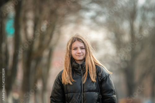 Portrait of a young beautiful blonde girl outdoors in autumn.