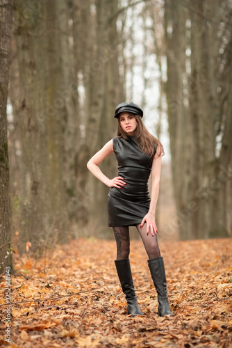 Portrait of a young beautiful brown-eyed long-haired girl in a black dress in nature.