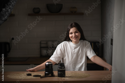 Portrait of a young beautiful dark-haired girl in the home kitchen.