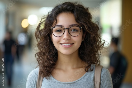 Portrait of a young beautiful Hispanic woman. Curly Latin American student in glasses stands in the hall of the university, college, looks at the camera