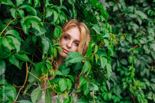 Portrait of a young beautiful woman, hiding in of wild grape leaves.