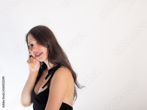 Portrait of a young black-haired girl with braces on her teeth on a white background. the girl smiles and laughs