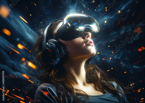 Portrait of a young cyberpunk girl wearing virtual reality goggles. Future technology concept. created with generative AI technology.