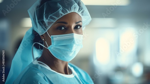 Portrait of a young female surgeon wearing a surgical mask and cap