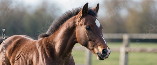 Portrait of a young foal against a natural background showcasing its beauty and grace in a serene outdoor setting.