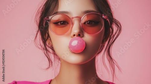 Portrait of a young girl blowing pink bubbles gum,Cute little girl with pink chewing gum on color background,child wearing sunglasses make bubble with chewing gum in studio background,copy space.
