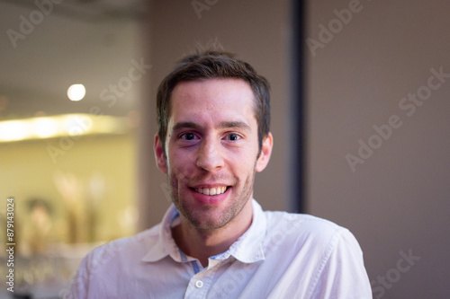 Portrait of a young guy looking at camera and smiling in a restaurant interior at a gala dinner, company dinner.
