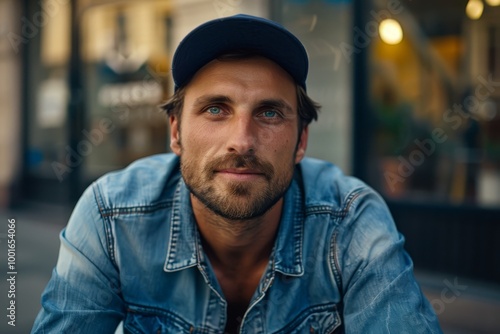 Portrait of a young handsome trendy man wearing a cap of blue jeans color