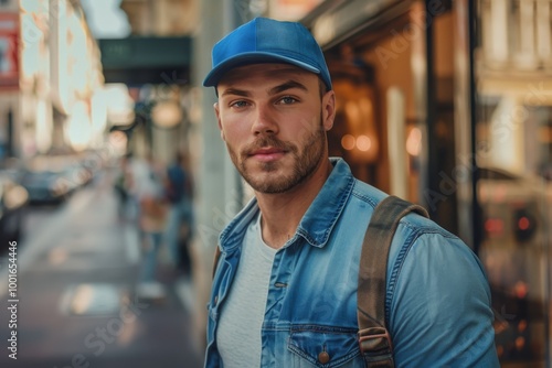 Portrait of a young handsome trendy man wearing a cap of blue jeans color