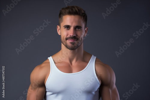 Portrait of a young man standing a front of a gray wall with hands in pockets and smiling at the camera.