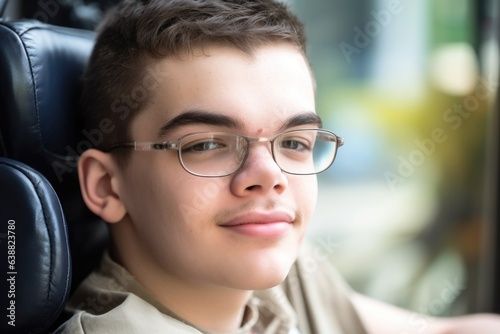 portrait of a young man with autism wearing spectacles while sitting in his wheelchair