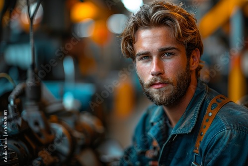 Portrait of a young man with stubble against an industrial backdrop, looking contemplative and confident