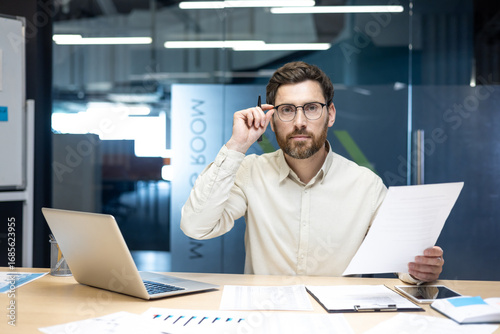 Portrait of a young man working in an office with documents, sitting at a table, supporting his glasses with his hand, looking at the camera