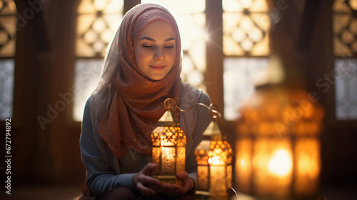 Portrait of a young Muslim girl in a headscarf holding a lantern.