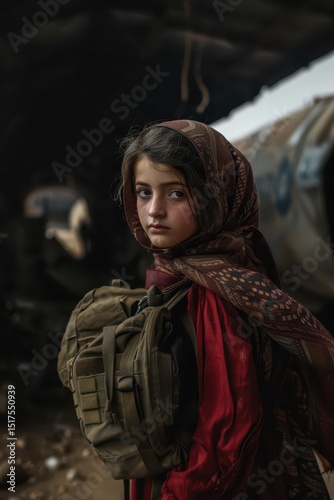 Portrait of a young refugee girl symbolizing resilience on world refugee day. Vertical poster. International Migrants Day. World population day