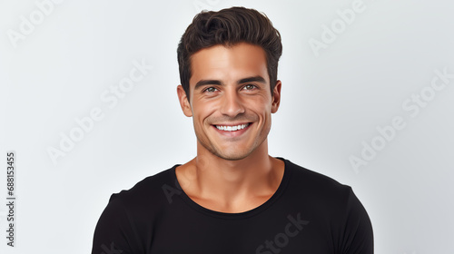Portrait of a young smiling man with black shirt. Skin care beauty, skincare cosmetics, dental concept. Isolated over white background.