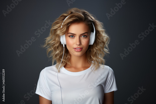 Portrait of a young stylish Caucasian woman in headphones on a dark gray background