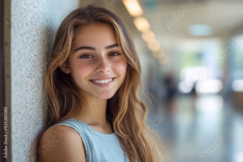 Portrait of a young, vibrant female student casually leaning against a wall in a high school hallway. She beams a warm, genuine smile while looking directly at the camera, radiating confidence and pos