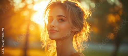 Portrait of a young woman enjoying a sunset in a park with a serene expression and natural light illuminating her features