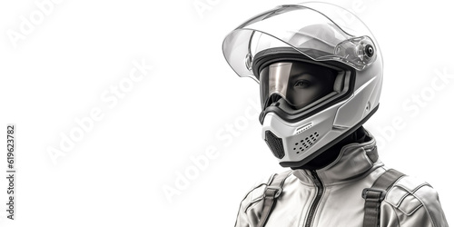 Portrait of a young woman in a motorcycle helmet and racing suit, close-up. Generative AI