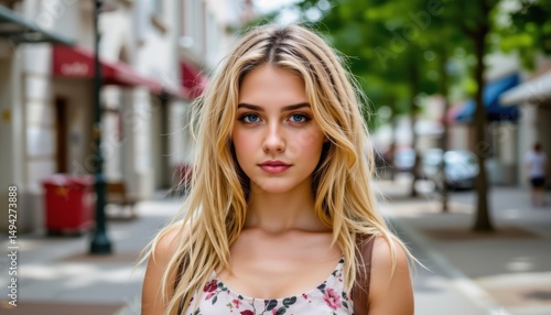 Portrait of a Young Woman with Blonde Hair and Blue Eyes on a Vibrant City Street During Daylight