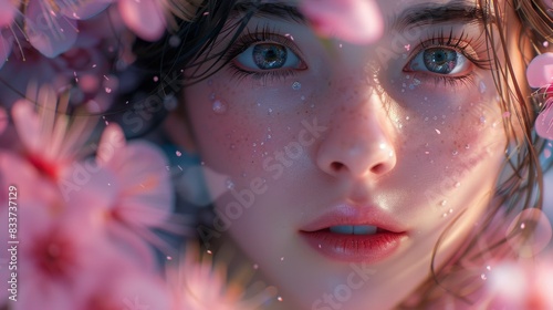 Portrait of a young woman with blonde hair and freckles surrounded by blooming cherry blossoms, highlighting her natural beauty.