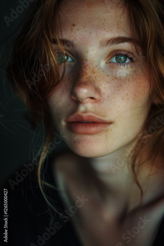 Portrait of a young woman with long hair and a serious expression, wearing a black turtleneck, against a dark background.