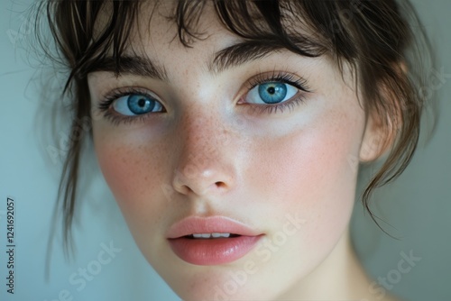 Portrait of a young woman with striking blue eyes and soft features in an elegant setting